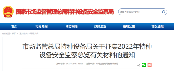 市場監管總局特種設備局關于征集2022年特種設備安全監察總覽有關材料的通知發表時間:2023-02-17 13:20