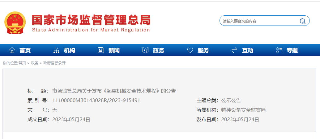 市場監管總局關于發布《起重機械安全技術規程》的公告發表時間:2023-05-25 09:55